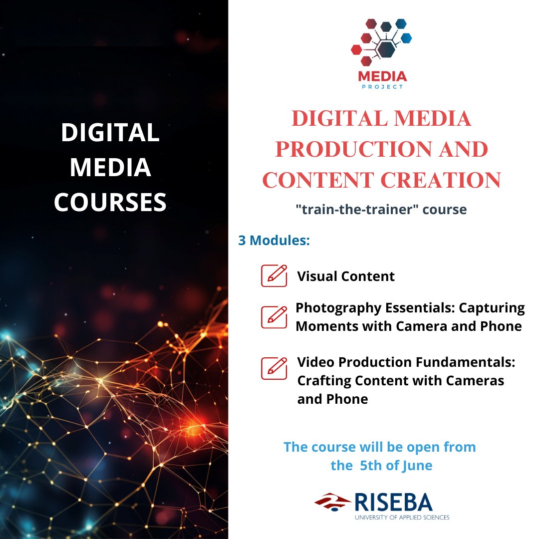 Exciting news from the MEDIA Project!  We are thrilled to announce the launch of the next phase of our MEDIA project, starting with an engaging series of courses provided by our esteemed partners at RISEBA and FHM University.   First in the Series: Digital Media Production and Content Creation This course is specially designed for educators from our partner institutions in Moldova and Armenia, aiming to deepen the knowledge and skills of course participants in digital media. Whether course participants are looking to enhance teaching methods or engage students more effectively, this course offers essential tools and insights into digital storytelling.   Course start date: June 5th  Course mode: Fully remote with live instructor support  Featuring: Expert lectures, interactive webinars, and a rich variety of podcasts tailored for educators.  What course participants will learn: Create high-quality visual content tailored for educational purposes Capture stunning photographs and professional videos using both smartphones and cameras Apply advanced techniques in lighting, composition, and post-production Utilize storytelling to craft compelling educational narratives through visual media Join us on this exciting educational journey to transform teaching methods and enhance digital media skills!