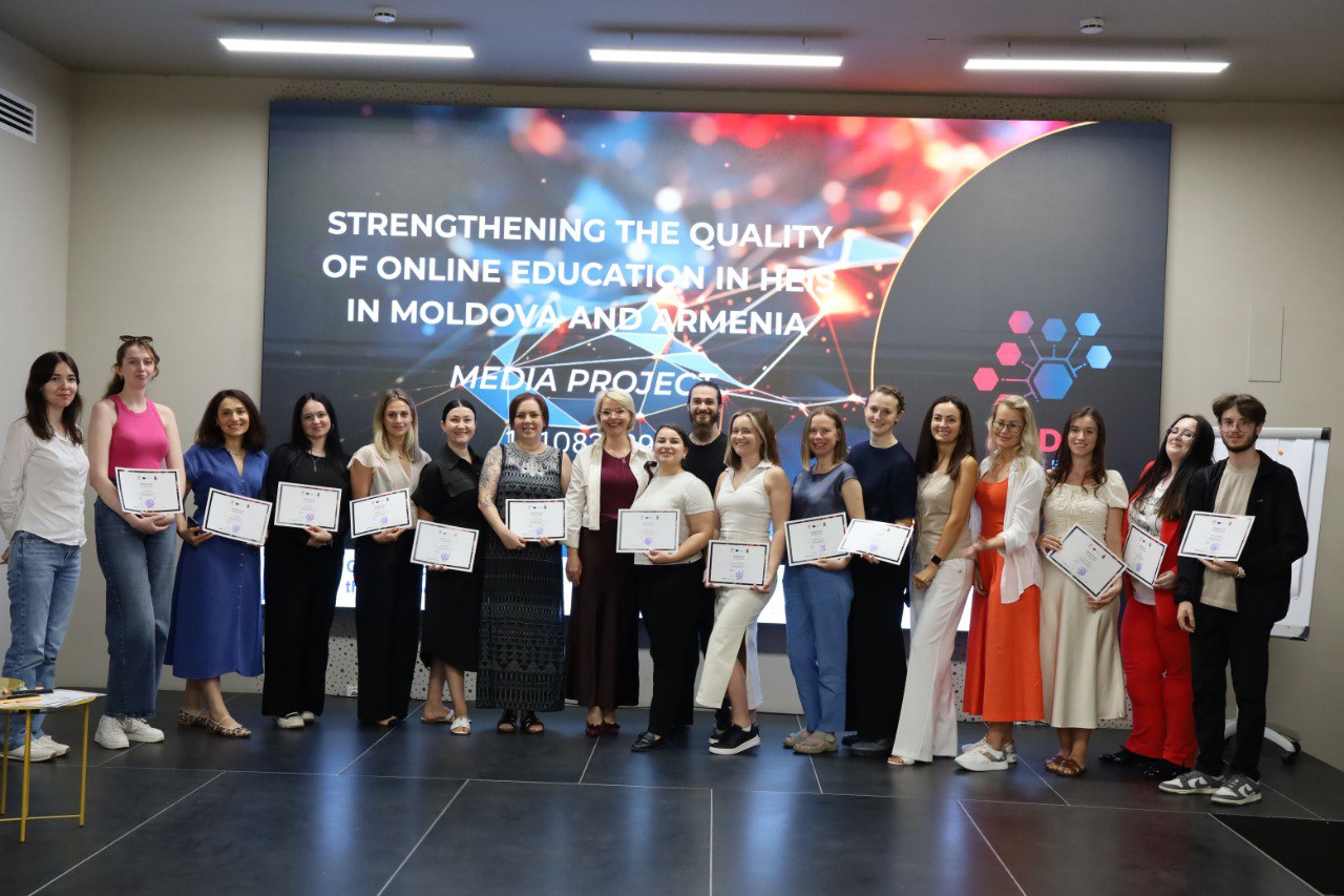 On July 19, 2025, the closing event of the first edition of the “Digital Marketing” program took place at Mediacor. The program was organized within the framework of the MEDIA project – Strengthening the Quality of Online Education in HEIs in Moldova and Armenia (101082889), co-funded by the European Union. After six months of intensive training, mentoring, and hands-on activities, the six participating teams presented their final projects in front of an audience of mentors, partners, and guests from academic and entrepreneurial fields. The event continued with the introduction of the professors who guided participants throughout the program, followed by the team presentations. The projects showcased were: Dräxlmaier – a global leader in the production of electrical systems and automotive components for the premium segment Pisarenko Women Energy – a style and beauty school that supports the reintegration and empowerment of women, including refugees Ainash Management Time – a consultancy specializing in time management and internal process optimization Skills Lab – short-term educational programs focused on strengthening practical skills Stella Vitinscaia Hair Stylist – modern hair care and styling services Admiral Travel – a leading provider of quality tourism services in the Republic of Moldova Each team had 7 minutes to present their project and 3 minutes for the diploma award ceremony, marking the results achieved through the program’s marketing strategies and the key performance indicators (KPIs) reached by the participating companies. The event concluded with a Q&A session, followed by a networking and socializing moment around a festive cake.